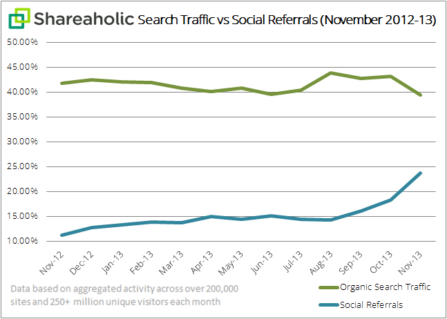 | Report: Over the past year, search traffic has dropped while social traffic more than doubled Posted: 17 Dec 2013 08:00 AM PST Social discovery and sharing platform Shareaholic today released a report comparing search traffic versus social traffic over the last 13 months. While it's no surprise that search is a mature tool and social is still a relatively new one, the biggest trend that immediately jumps out is that the former has started declining while the latter is still exploding. In November 2012, search traffic accounted for almost 42 percent of traffic while social referalls were at just over 11 percent. In November 2013, search traffic had slipped a few percentage points while social referalls had more than doubled. Here are Shareaholic's two biggest takeaways from the results: